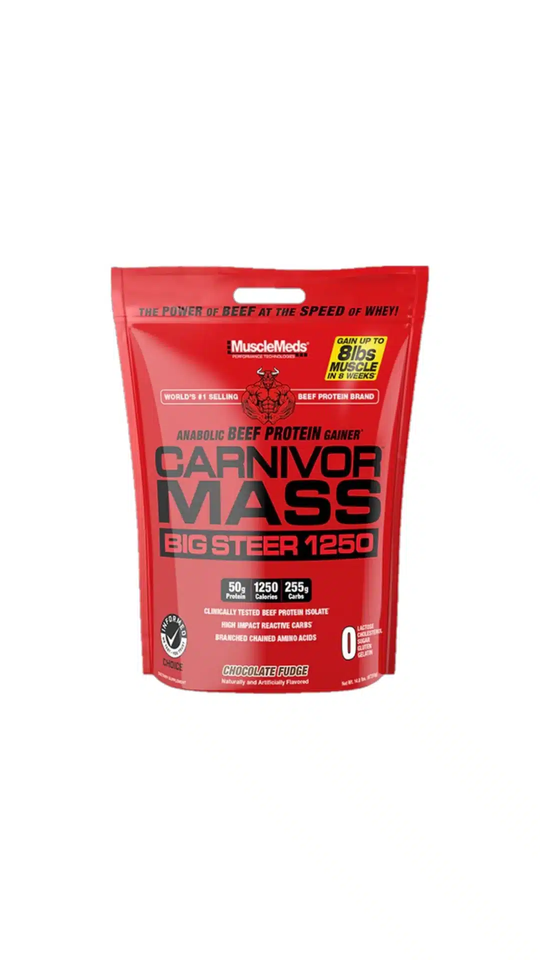 CARNIVOR MASS BIG STEER 1250 es un ganador de masa altamente anabólico científicamente desarrollado. Es una combinación exclusiva de aislamiento de proteína de carne de res hidrolizada Carnívor clínicamente probada, 8.99 oz de carbohidratos reactivos mejorados, optimizadores de insulina y 1250 calorías que crean el entorno ideal de construcción de masa para ganancias serias