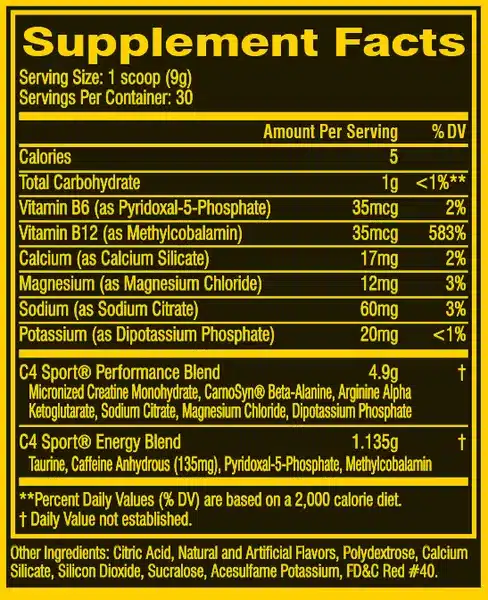 Deliciosos sabores a diferencia de cualquier cosa en el mercado: frambuesa azul, ponche de frutas y sandía. Toma una porción (1 cucharada) de C4 Sport, mezclado con 6 – 8 onzas líquidas de agua 20 – 30 minutos antes del entrenamiento.