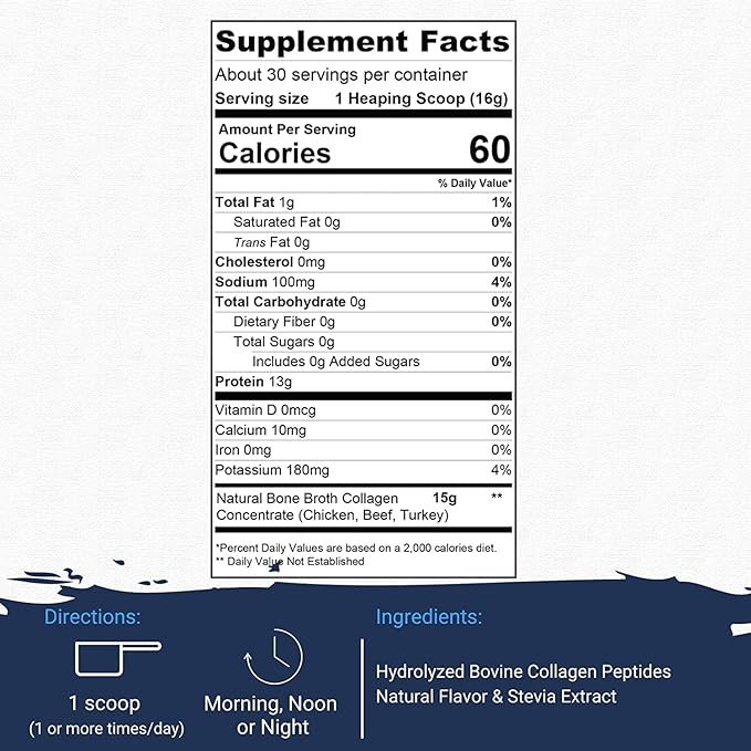 El caldo de huesos es un extracto de huesos totalmente natural de nuestro suministro de alimentos. Contiene 15 gramos de colágeno de tipo I, II y III para ayudar a mantener la salud de las articulaciones, el sistema digestivo y el sistema inmunológico. Con 13 gramos de proteína y altas concentraciones de glucosamina y condroitina, el caldo de huesos podría tener un efecto monstruoso sobre la inflamación, las articulaciones, los tendones, el rendimiento deportivo y la recuperación muscular. †