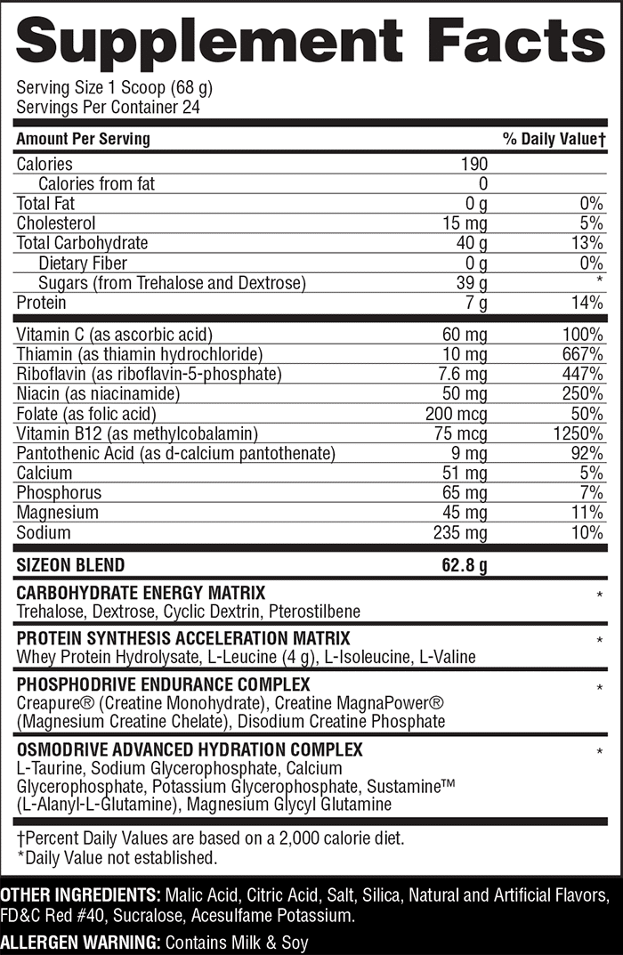 Size On Maximum Performance contiene cuatro complejos diferentes para promover la síntesis rápida de proteínas, el suministro avanzado de creatina, la reposición de electrolitos y un poderoso aumento de insulina para ayudar a entregar creatina, proteínas y otros nutrientes a las células musculares hambrientas. Se utilizan varios azúcares simples para aumentar la insulina durante su entrenamiento, impulsando los BCAA, hidrolizados de proteína de suero y sustamina (glutamina) en los músculos. Si está buscando mejorar la recuperación del entrenamiento, optimizar la nutrición durante el entrenamiento y explotar la sensibilidad a la insulina, Size On Maximium Performance es el complemento perfecto para usted.