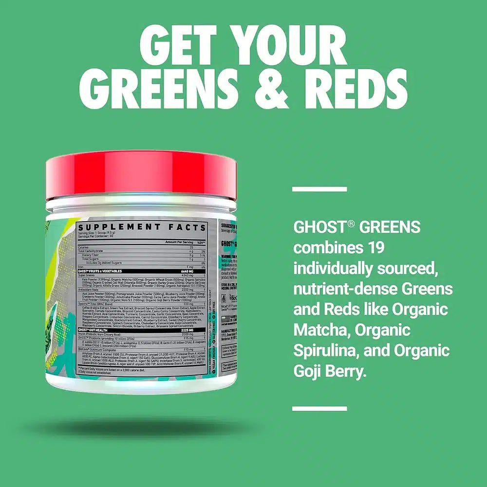 ¡Es más fácil que nunca conseguir tus frutas y verduras! GHOST Greens combina 19 verdes y rojos de origen individual con una mezcla súper antioxidante Spectra, Prebiotics, un probiótico de 10 mil millones de UFC y enzimas digestivas completas BioCore Optimum Complete Además, nos hemos asociado con ONE TREE PLANTED para plantar un árbol por cada tina vendida. Sabor original. 30 porciones por recipiente.