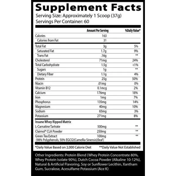 Insane Whey Ripped 4.5 Lbs – Insane Labz. Los componentes clave probados para pérdida de peso en la fórmula Insane Whey RIPPED son los ingredientes L-Carnitina, Clarinol CLA y Extracto de Té Verde.
