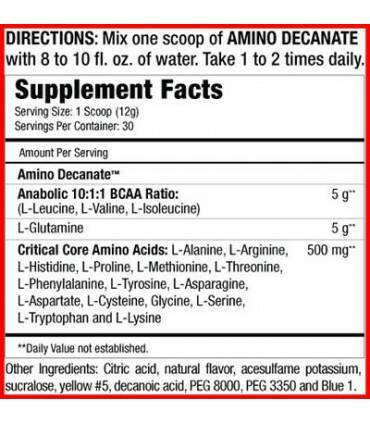 AMINO DECANATE: La fórmula de aminoácidos científicamente avanzada de MuscleMeds está diseñada para desencadenar mayores efectos anabólicos y prevenir la deficiencia de aminoácidos limitantes de la velocidad y el catabolismo a menudo experimentado durante los entrenamientos intensos. La investigación muestra que, si bien los BCAA y la Glutamina son los principales actores en el crecimiento muscular, otros 15 aminoácidos conocidos como aminoácidos críticos (CCAA) también juegan un papel fundamental. De hecho, una vez que se haya agotado alguno de estos aminoácidos, su crecimiento y rendimiento muscular pueden verse comprometidos. Este fenómeno se conoce como el «Factor de Aminoácidos Limitantes de la Velocidad». Cada porción de AMINO DECANATE proporciona los 19 aminoácidos críticos para el desarrollo muscular máximo, mejorando el rendimiento y acelerando la recuperación.