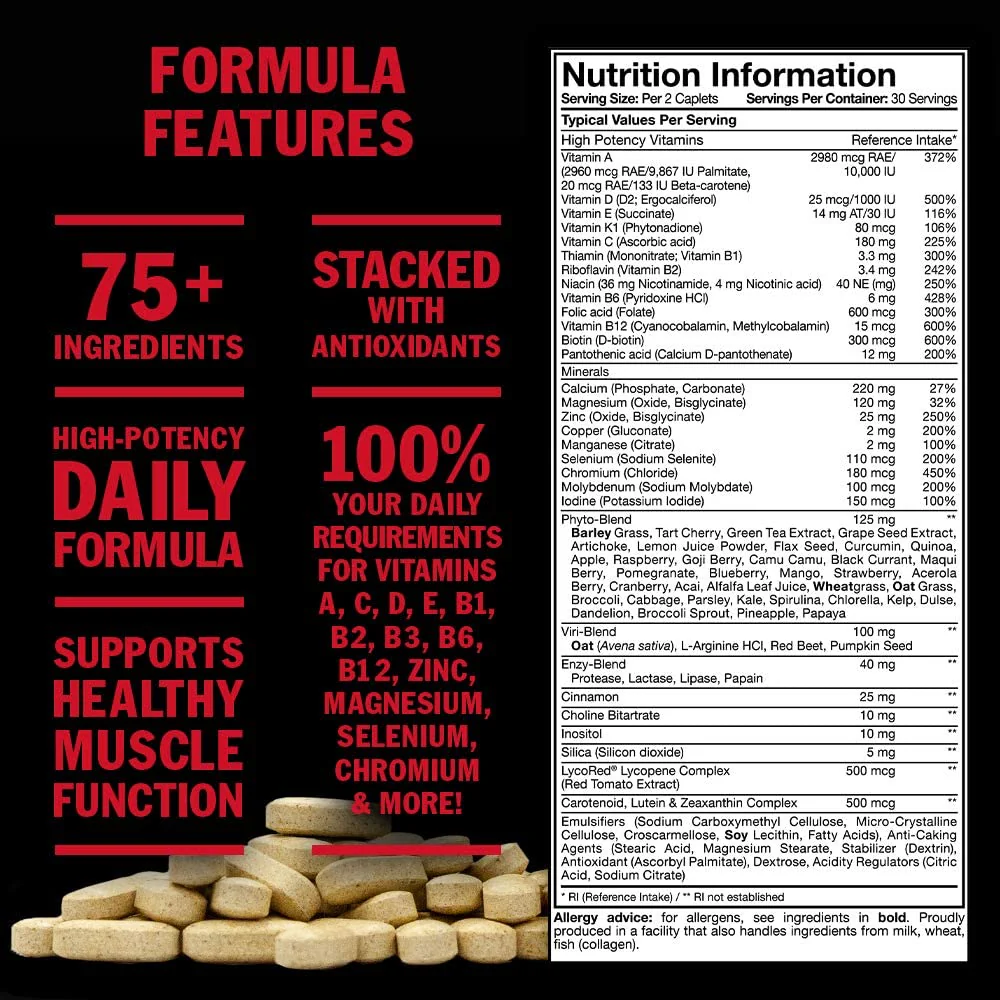 MUTANT MULTI es una fórmula completa de seguro nutricional que aprovecha más de 75 ingredientes en múltiples sistemas, específicamente formulados para las duras realidades de entrenamients extenuantes. Vitaminas de alta potencia, minerales que incluyen electrolitos, fitonutrientes, extractos botánicos, antioxidantes, enzimas, bayas y verduras, factores lipotrópicos, TODOS entregados en tabletas fáciles de digerir. Comienza cada día con una buena comida más tus MUTANT MULTI y ¡ya estás en camino!