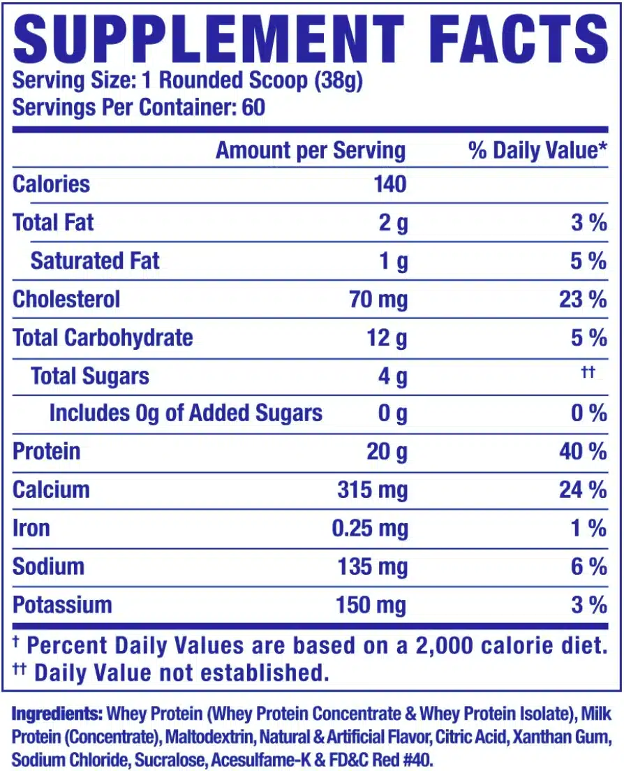 - Proteína de suero de leche de alta calidad: contiene 58 servicios de 20 g reales de proteína por cucharada con solo 2 g de grasa y 4 g de azúcar