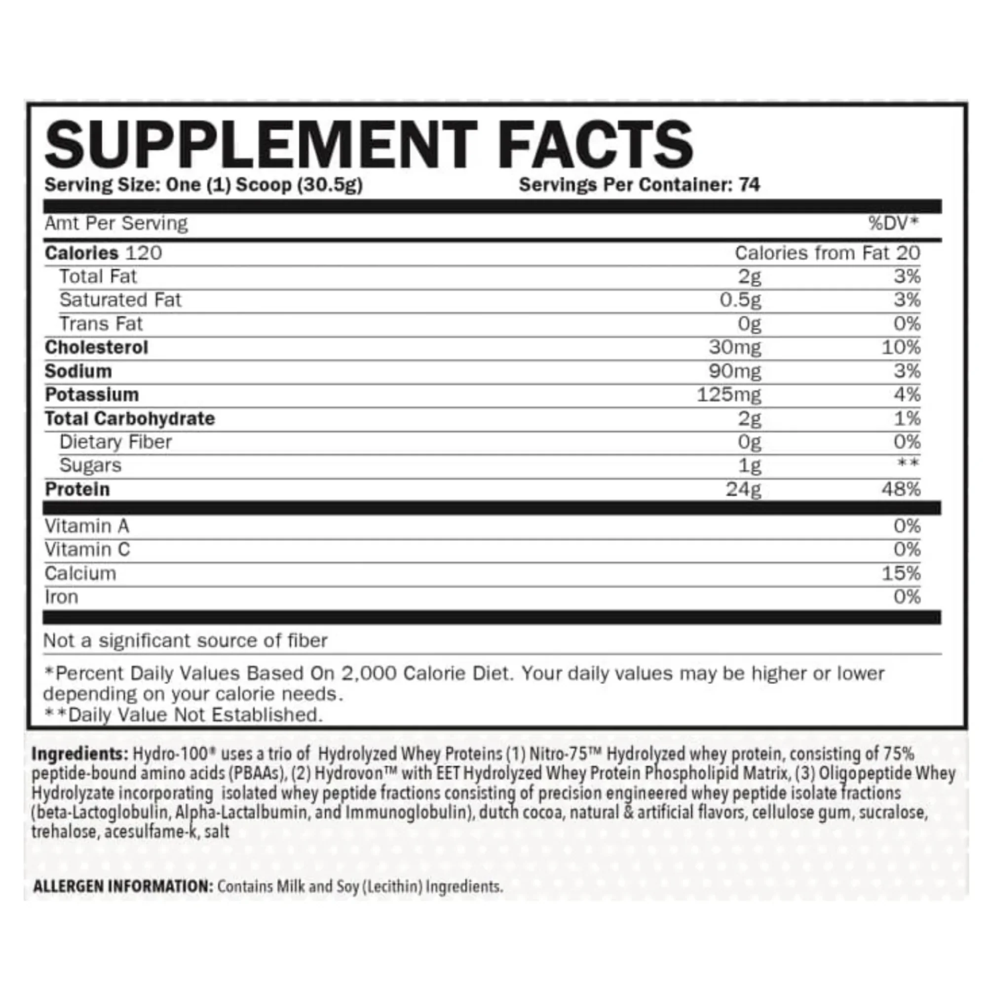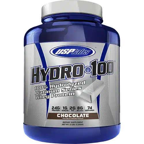 Hydro 100 es un polvo de proteína del suero de leche en forma hidrolizada (whey protein hydrolyzed) formulado por USPLabs.